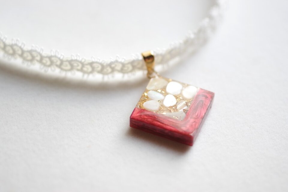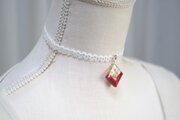 ホワイトシェルのさざれを沈め、光沢のあるルビーレッドで囲ったレジンを、サテンリボンにタティングレースで装飾を施したチョーカーに仕上げました。