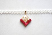 【受注製作】レジンアート スクエアモチーフとタティングレースとサテンリボンのチョーカー〈真珠色の声・ルビーレッド〉