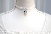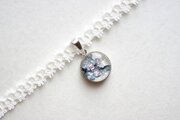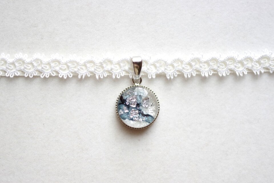 落ち着いたブルーグレーと銀箔が繊細な雰囲気を生んでいるレジンを、サテンリボンにタティングレースで装飾を施したチョーカーに仕上げました。