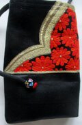 中綿を入れ、黒の正絹の着物で作ったループを付け、ループの先にトンボ玉と山サンゴを付けています。