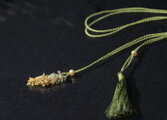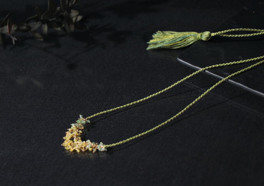 アネモネカラー・天然石と絹のネックレスパールの位置によって、長さはもちろんトップの形を変えられるのがユニークで変化が楽しめて嬉しいです。 以前ネックレスを落としてしまったことがあるので、被り式のネックレスは安心して身につけられて助かります。 ネック部分やタッセルがシルクで、汗ばむ季節にも肌あたりが柔らかそうで嬉しいです。トップに合わせたタッセルの色合いも好きです。 素敵な作品をありがとうございました!