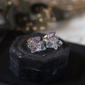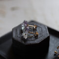 透明感のあるライラック色が美しいアメジスト、淡いグリーンの八面体結晶のフローライト、ころんと尖った輝きの強いダイヤモンドクォーツ。それぞれ表情の違う鉱物が共生し、ひとつの鉱物標本になったようなデザインです。