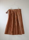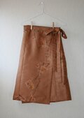 昭和に作られたと思われる銘仙の着物を丁寧にほどき、黄土色の羽織から、軽やかな巻きスカートを作りました。着物の着姿からヒントを得た巻きスカートです。正面から見ると織りで表された柄と腰に巻きつけるデザインが古風な印象ですが、後ろスカートの部分だけにタックを寄せてふんわりさせてかわいらしさを。前スカートはタックなしで腰回りをすっきり見せています。脇でリボンを結んでアクセントを。