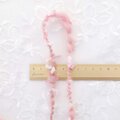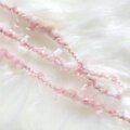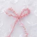 桜色のウールとシルク繊維をブレンドし、ひらひらとした飾り糸と合わせています。