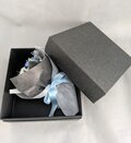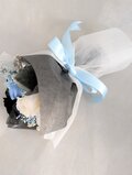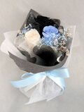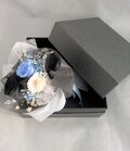 プリザーブドフラワーの黒、白、ブルーのミニ薔薇と小花やグリーンを少しずつ使用したミニ花束です。黒いギフトボックスの中に入るミニ花束。黒いミニ薔薇に淡い色のお花をあわせて、透明感のある花束です。