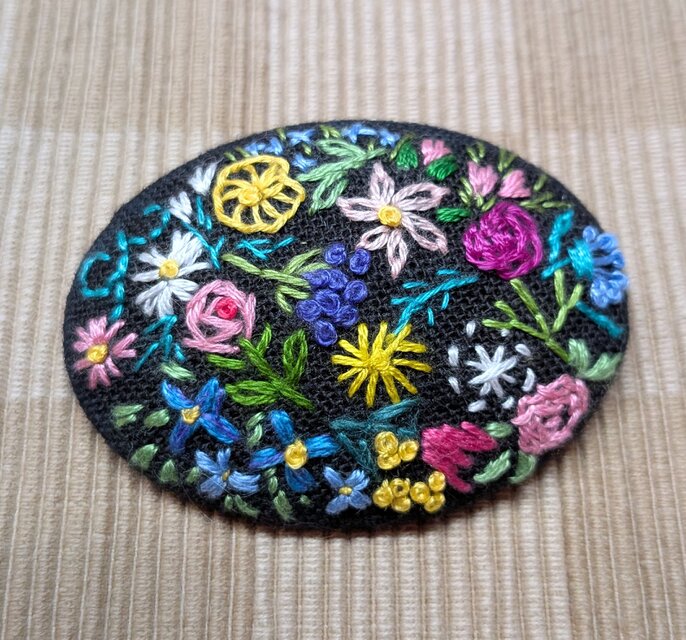 黒地の綿に、手刺繍で、全て違う可愛い小さいお花を一面に散りばめたブローチです。