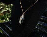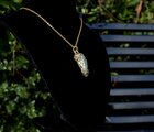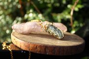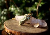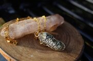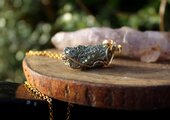 フラットでキラキラと輝く面と、ゴツゴツとしたキュービック状の面、どちらも非常に美しいので、両面が表になるようにゴールドのワイヤーで巻いてあります。