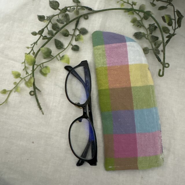 ハンドメイド♡メガネケース♡リネンパステルカラフルチェック♡♡普通タイプ