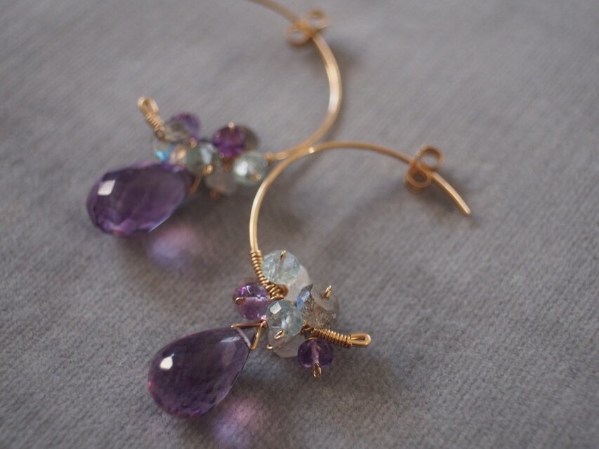14kgf 雫アメジストフープピアス k14gf 宝石質 ドロップカット ブリオレットカット