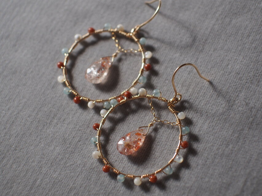 14kgf サンストーンのアースカラーフープピアス k14gf タンザニア産 マイカサンストーン