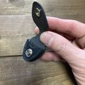 ポケットの中で不意に開いてしまわないよう留める力の強いニッケルのドットホックボタンを使用しそのボタン周りには黒色の姫路レザーをワンポイントに入れています。