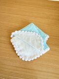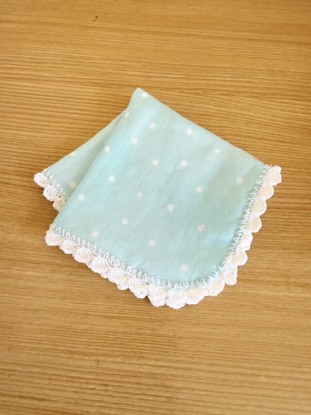 ダブルガーゼを2枚合わせにし、レース編みでふちどりをしました。