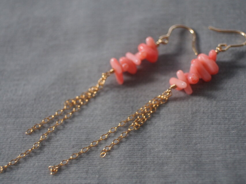 14kgf 桃色珊瑚のチェーンシンプルピアス k14gf 華奢 サンゴ コーラル