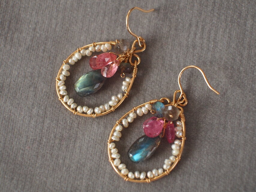 14kgf ラブラドライトとピンクトルマリンと粒々極小パールピアス k14gf