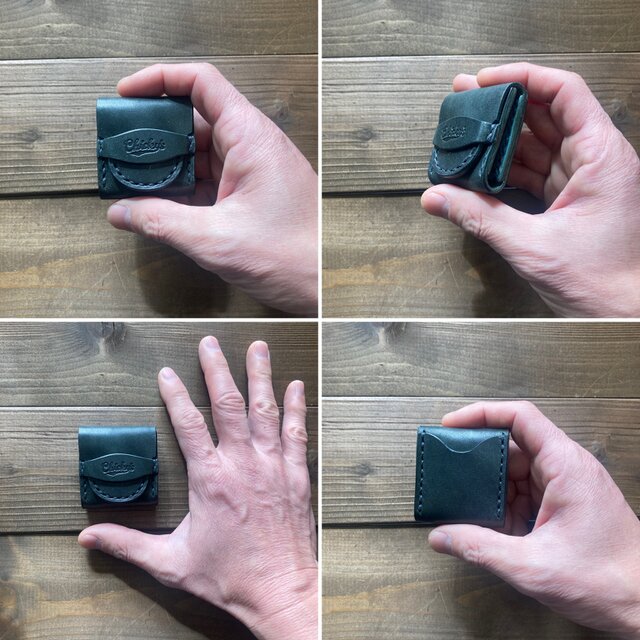本体のメイン部分に緑の蝋引き革を、マチには青緑の姫路レザーを使い紺色の糸で仕上げている同系色のバイカラータイプです。