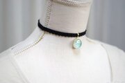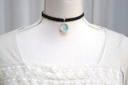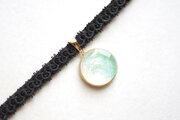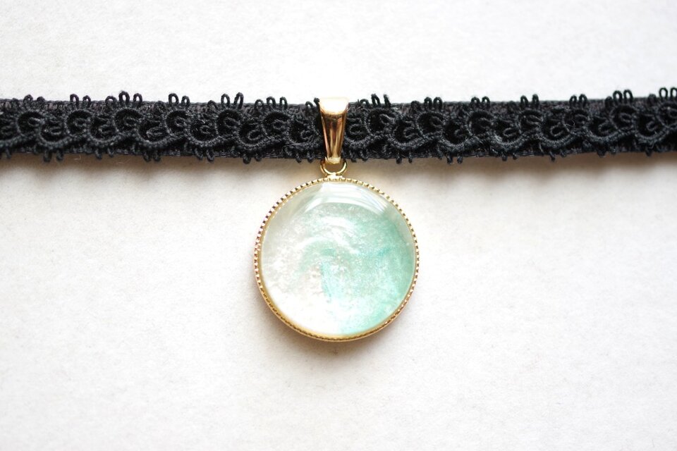 池に、水溜りに張る薄氷のような、薄く脆い、繊細な緑色の、触れたら壊れそうな緑色のレジンを、ベルベットリボンにタティングレースで装飾を施したチョーカーに仕上げました。