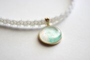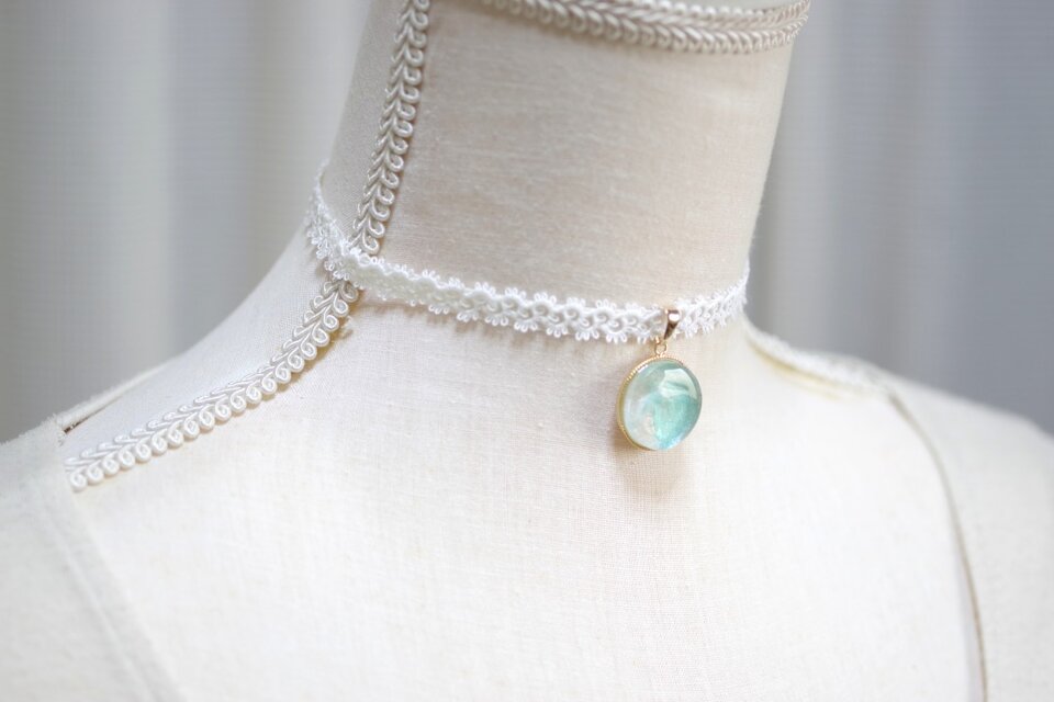 池に、水溜りに張る薄氷のような、薄く脆い、繊細な緑色の、触れたら壊れそうな緑色のレジンを、サテンリボンにタティングレースで装飾を施したチョーカーに仕上げました。