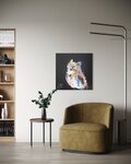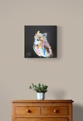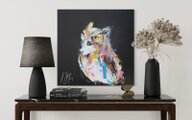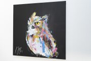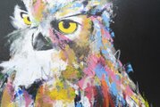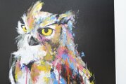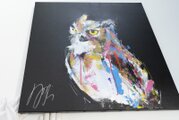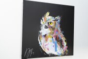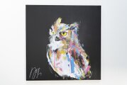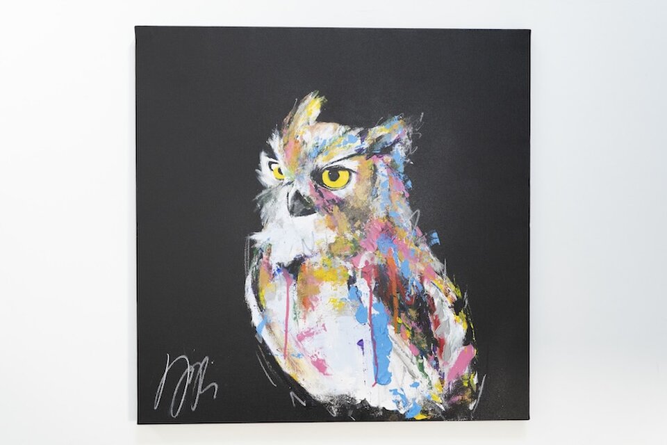 動物シリーズからフクロウのスプレーアート作品!知性や幸運の象徴でもあるフクロウを正方形キャンバスに表現した作品。沢山の色を使って表現されたフクロウがかっこよくもあり、可愛らしい作品になっています。フクロウ好きには大変おすすめで、贈り物の絵としてもおすすめです。