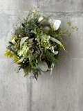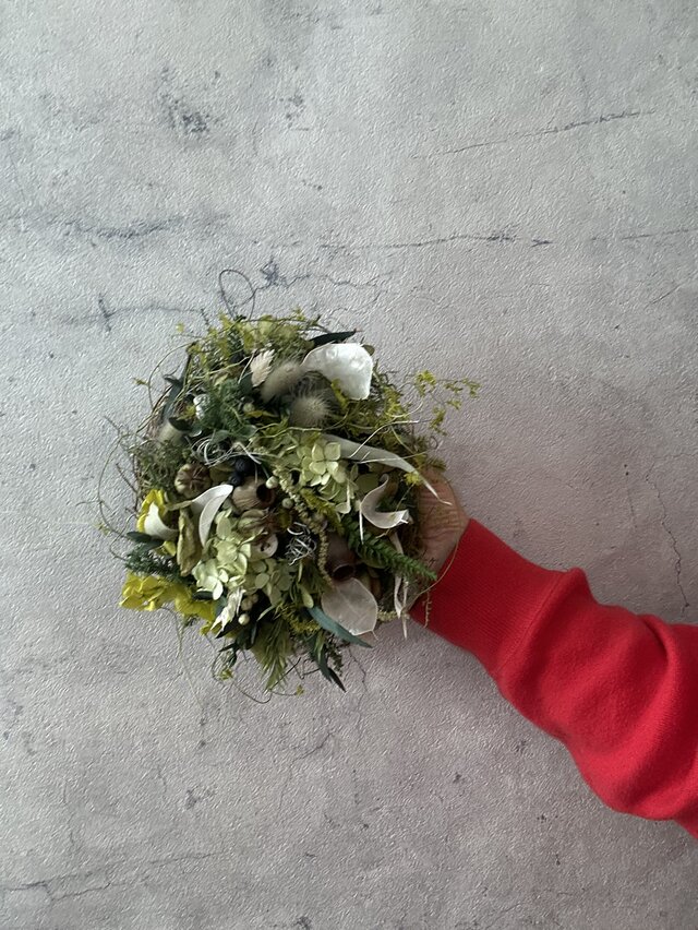 サイズ約23×20㎝長くお楽しみ頂けるプリザーブドフラワーで仕上げました。個性ある形でも優しい雰囲気にまとめました。時間経過によりいずれはゆっくりと退色していきますが、飾る場所によって色もちは異なります。なるべく光や日差しが当たらない涼しい屋内の場所ですと、いい状態を保ちやすいです。お花が過ごしやすい場所に飾ってあげるのもいいのですが、お客様が1番飾りたい場所で飾っていただくのもいいかもしれません。