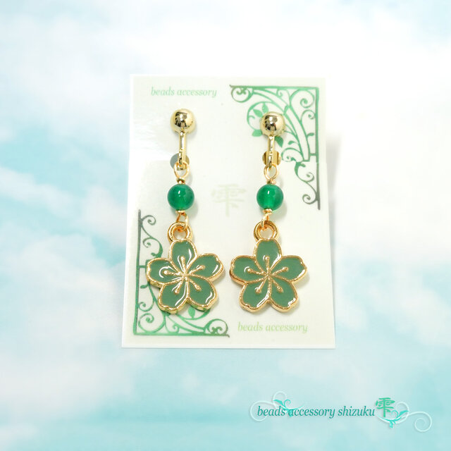 ブルーグリーンの桜チャームが爽やかな可愛さのイヤリングです。