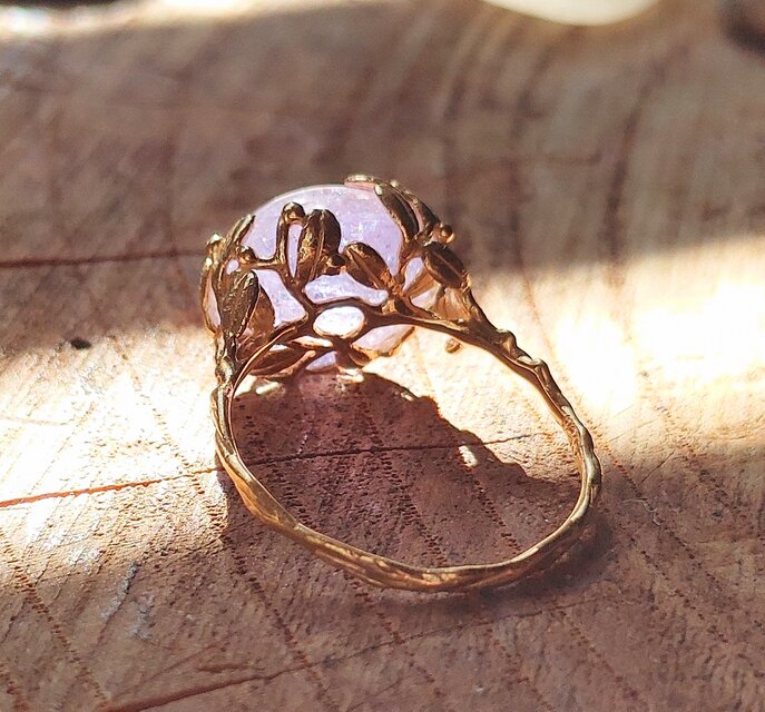 ご連絡遅くなり申し訳ありません。無事お品が到着しました! 梱包がとても可愛く、開けるのがもったいないくらいでした。 お品は繊細な葉っぱと石の綺麗な緑色で、どの光源で見ても映える美しさです…! 制作中の経過を拝見できたのも嬉しく、より愛着が湧きます。 大切に使わせていただきます!