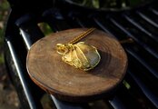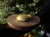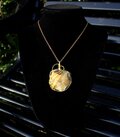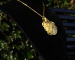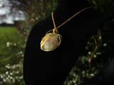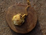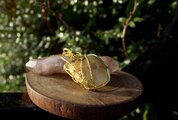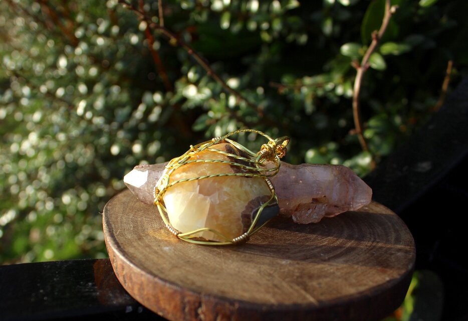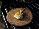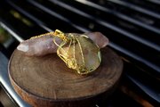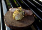 光沢があり、色目も美しいセプタリアンのカボッションをゴールドのワイヤーで巻きました。上品で華やかながら、落ち着いた癒しの波動を与えてくれる石です。