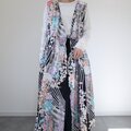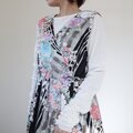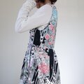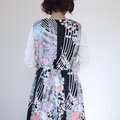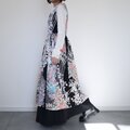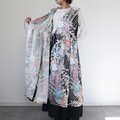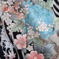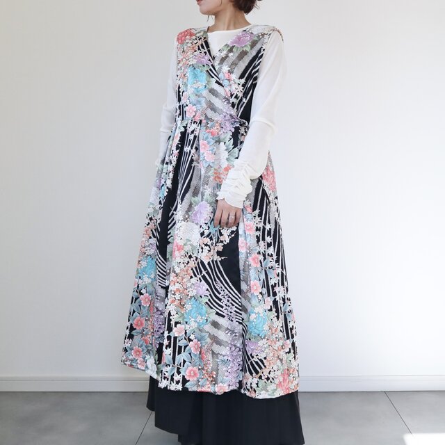 アンティーク着物から作ったノースリーブのカシュクールワンピースです。黒地に梅、牡丹、菖蒲、椿、菊などの花の柄が春らしくとても素敵です。薄手で柔らかですがしっかりとした綸子素材。ウエストの切り替え位置にはランダムにタックを入れています。前を開けてジレにように着たり、外側の紐通しを結んでゆったり着ることもできます。裏地はありません。