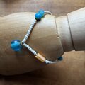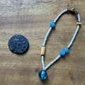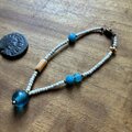 トップはインドのナガ族に渡ったセミクリアの水色ビーズ とても綺麗な水色、チェーンにはジャワの現行品、古色仕上げのシードにナガ族のちぃさなみかん玉不透明ビーズとセミクリアのビーズやベネチアのパイプビーズ