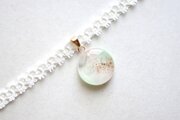 淡いピンクとグリーンが混ざり合い、まどろむような優しく幻想的な色合いを作り出しているレジンを、サテンリボンにタティングレースで装飾を施したチョーカーに仕上げました。