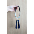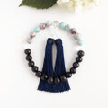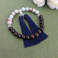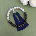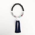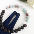 黒檀と天然石『パステルブルーカラーカオリン』を上下半々に配した略式数珠です。