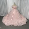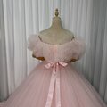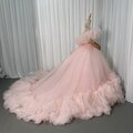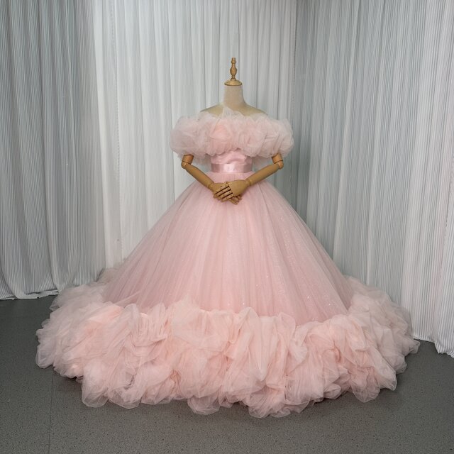 美品!カラードレス 薄ピンク オフショルダー 華やかなトレーン プリンセスライン キラキラチュール 前撮り