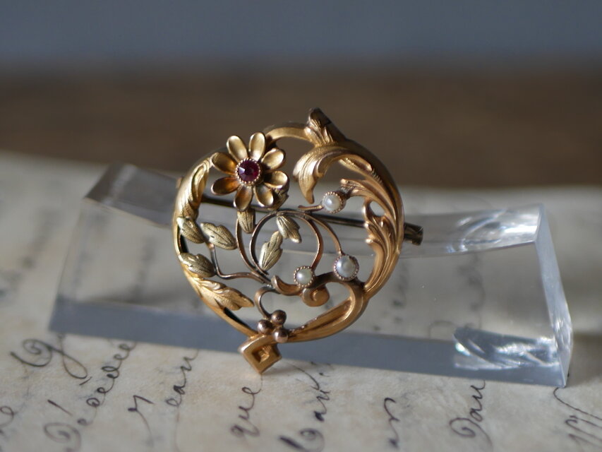 ゴールドプレート 赤い石とシードパール ブローチ フランスアンティーク アンティークのある暮らし