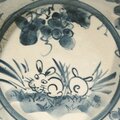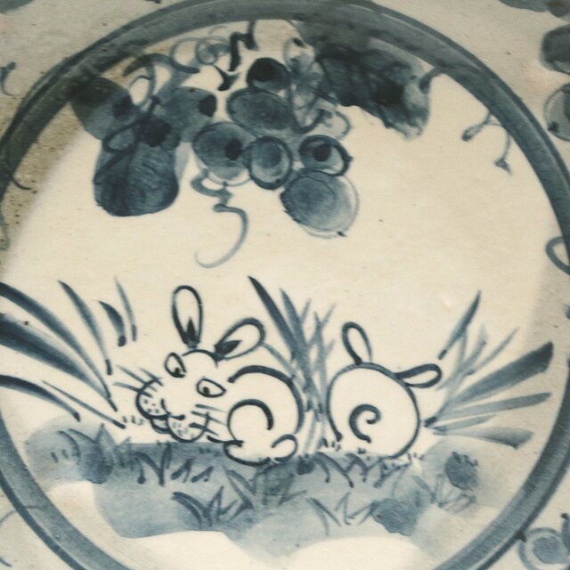 染付技法でゴスという絵の具で、800度で焼いた素焼の状態で絵を描き、