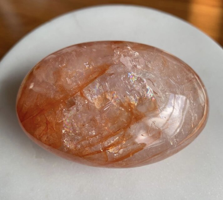 虹がキラキラ入っているレッドクォーツの握り石です。