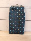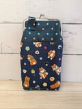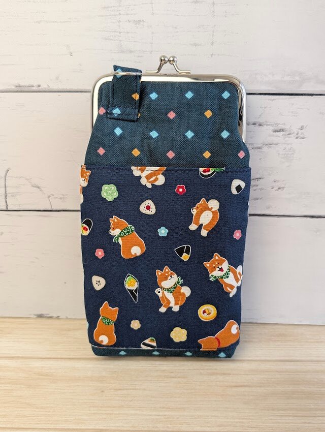緑がかった深いブルーの中に散りばめられたカラフルな四角模様と、愛らしい柴犬たちが散りばめられたポケットの付いた、和モダンなスマホショルダーがま口ポーチです。