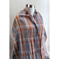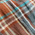 オレンジブラウンとグレーに、ターコイズブルー、くすみイエロー、白のラインが入ったチェックです。