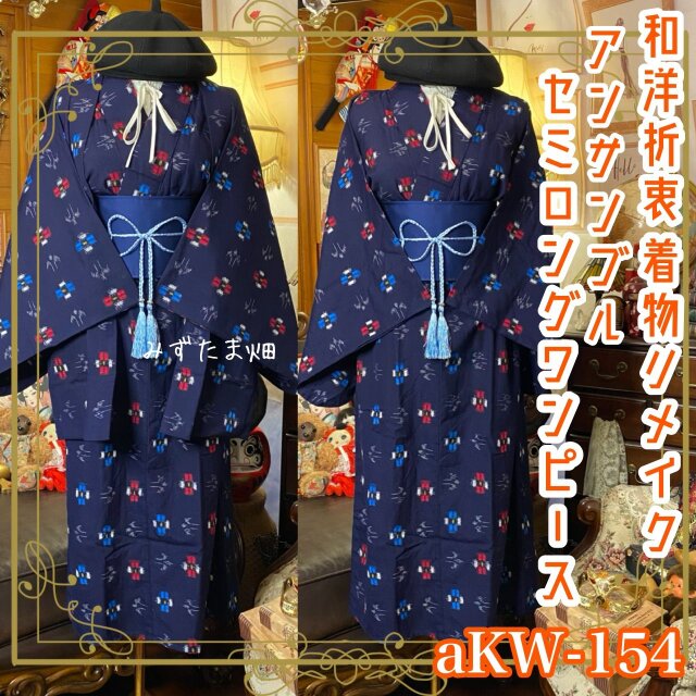 【 和洋折衷セミロングワンピース 着物アンサンブル 名古屋帯サッシュベルト付き ハンドメイド レトロ 古着 藍の記憶 × 伝統絣のモダン・グラフィックス aKW-154】