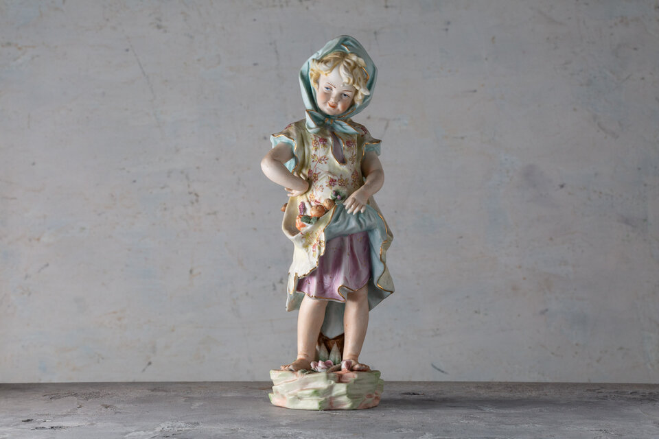 果物をそっと抱えた田舎の子供――やさしい表情と佇まいが、どこか詩的で懐かしい気持ちにさせてくれる瀬戸焼人形です。
