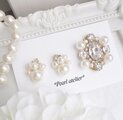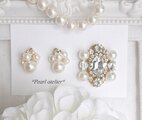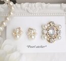 サイズの異なるパールをボリュームたっぷりあしらい、1粒クリアビジューを添えて輝きをプラスしたピアスと、統一感のあるビジューとシルキーパールを使用したブローチのセットになります。