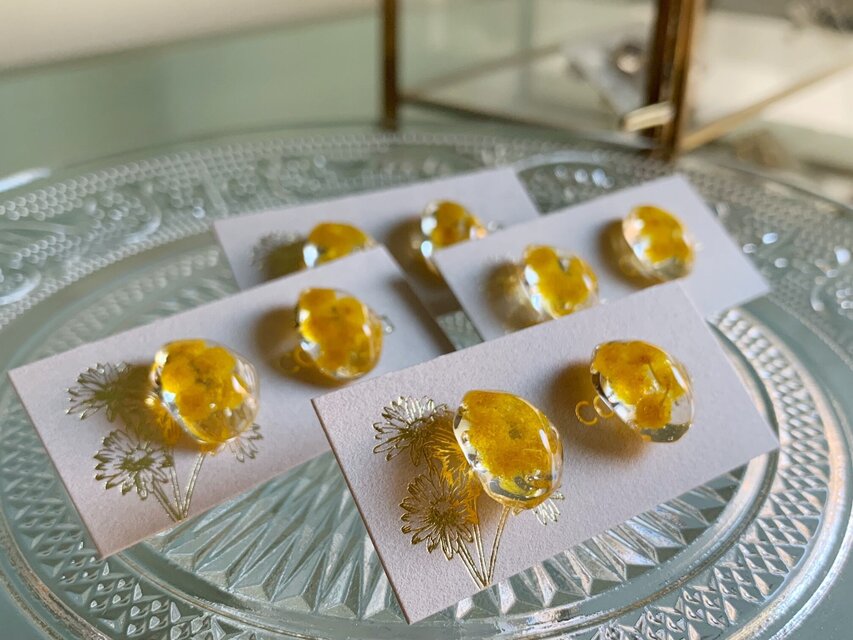 感謝とやさしさを、そっと耳元に。生花ミモザを閉じ込めた一粒レジンイヤリング/ピアス
