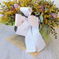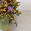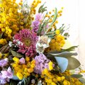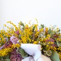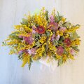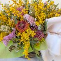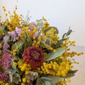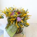 花材:ミモザ、ユーカリ(2種類)、ガーベラ(2種類)、アトランティア、カスミソウ、スターチス