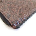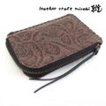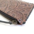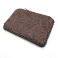 〇ペイズリー柄が型押しされたダークブラウンのクラック加工レザーをブラックのレザーでグルっとかがったフラットタイプのコインケースです(^^/