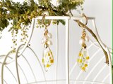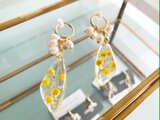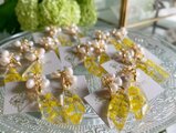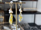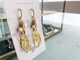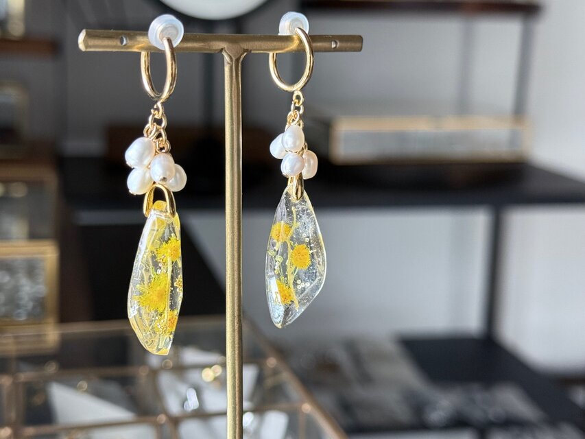 このイヤリングでは、生花のミモザを丁寧にドライフラワーにし、