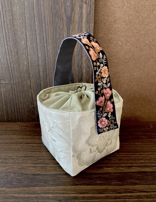 一目惚れでした。お届けしていただいて見た瞬間に笑顔になりました。お花の繊細な織り柄がふわり浮かび美しいですね。内布のお花のお花も留めてるビーズもステキで見てるだけで幸せな気持ちになれます。お上品な美しさで好きです。お優しさで可愛い巾着のプレゼントまでありがとうございます。インスタで可愛いって思ってたので嬉しすぎました。心からありがとうございます。たいせつに持たせていただきます。