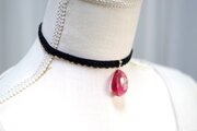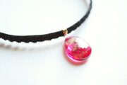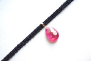 ドロップ型にお花を二輪咲かせた可憐なレジンを、ベルベットリボンにタティングレースで装飾を施したチョーカーに仕上げました。