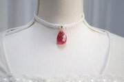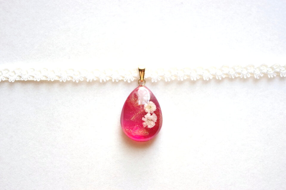 ドロップ型にお花を二輪咲かせた可憐なレジンを、サテンリボンにタティングレースで装飾を施したチョーカーに仕上げました。