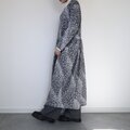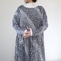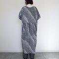 ローウエストで生地を切り替えギャザーをたっぷり入れていますがコクーン(繭)シルエットの為裾の広がりは控えめです。襟ぐり広めで裏地はありません。パンツとの重ね着もおすすめな、ゆるっとしたシルエットが特徴のワンピースです。