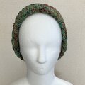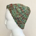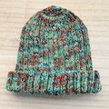 ロンドン製の赤を基調にした高級ミックス毛糸とグリーンのオパール 単色毛糸の2本取りで、2目ゴム編み帽子を編みました。ふかふかで、暖かく、すっぽり被りやすい、可愛いニット帽です。