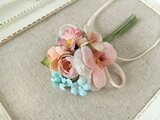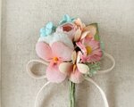 ビオラや小バラをメインにデイジーなど様々な小花を交えて花束のようにした小ぶりなコサージュ。
