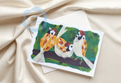 木の枝で羽を休める三羽のすずめをオイルパステルで描きました